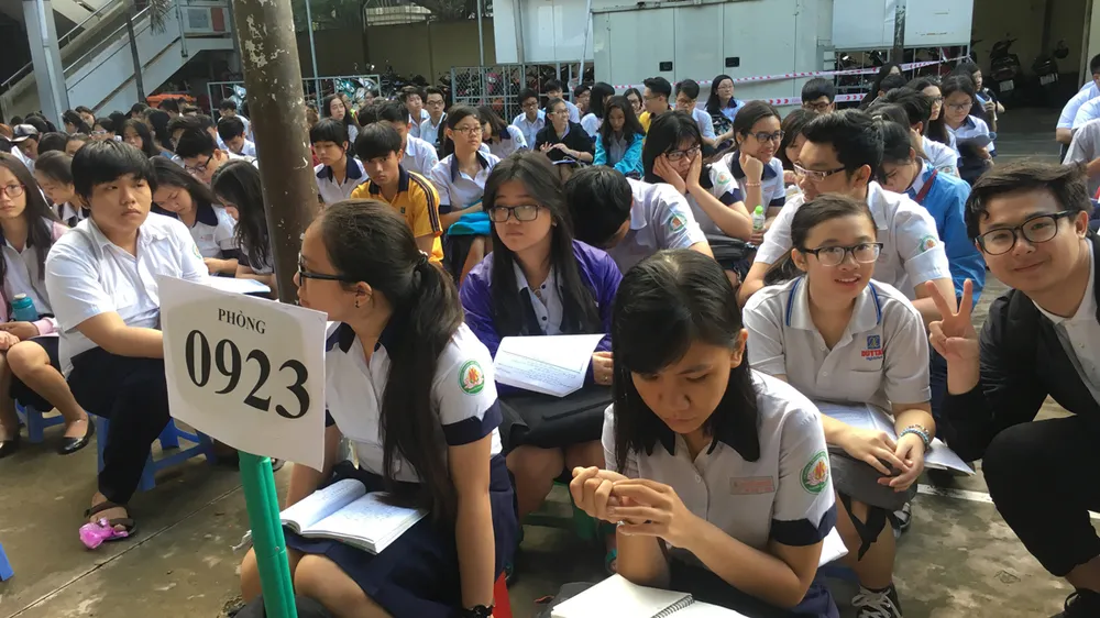 Từ sáng sớm các thí sinh đã được phụ huynh đưa đến các điểm thi trên địa bàn TPHCM. Tại điểm thi THPT Diên Hồng quận 10, nhiều thí sinh đến từ 6 giờ sáng, các em đã ngồi ngay ngắn ở sân trường để nghe hội đồng thi phổ biến quy chế thi thêm lần nữa và nhắc nhở những điều nên tránh để không phạm quy chế thi. Tuy nhiên, do còn tâm lý lo lắng, nhiều em vẫn cầm trên tay đề cương ôn tập và tranh thủ ôn lại kiến thức trước giờ thi.