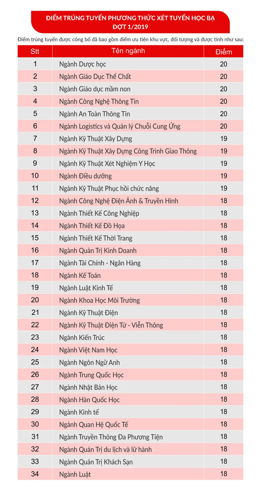 Cùng ngày, Hội đồng Tuyển sinh Trường Đại học Quốc tế Hồng Bàng chính thức công bố điểm trúng tuyển (có điều kiện) hệ đại học chính quy theo phương thức xét học bạ THPT đợt 1 năm 2019. Theo đó, thí sinh có điểm trúng tuyển cao nhất trong đợt 1 là ngành Dược với 29,95 điểm.
