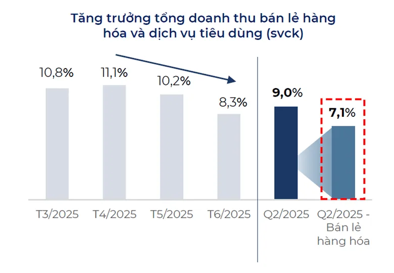 Trong khi đó, người tiêu dùng thể hiện tâm lý thận trọng, đặc biệt là nhóm thu nhập thấp và người lao động tại các khu công nghiệp, do lo ngại chi phí sinh hoạt tăng cao và khả năng mất việc. Theo đó, chi tiêu cho hàng hóa và dịch vụ tiêu dùng suy yếu rõ rệt từ tháng 5 đến tháng 6, với tăng trưởng doanh thu bán lẻ hàng hóa giảm từ 11,1% xuống 8,3% (so với cùng kỳ). Mức giảm này tác động trực tiếp đến doanh số ngành FMCG, đặc biệt trong các danh mục thiết yếu.