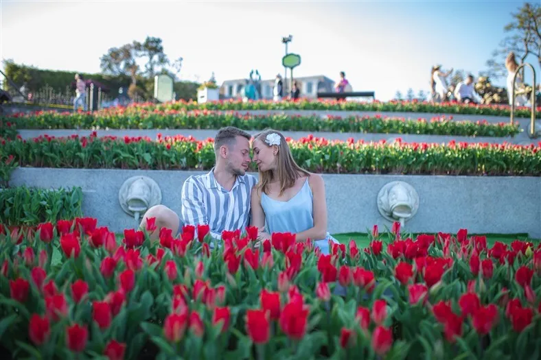 Là loài hoa chỉ nở rộ vào mùa xuân, mùa của sức sống mãnh liệt, mùa của những khởi đầu mới, hoa tulip là biểu tượng của sự giàu có sung túc và tình yêu vĩnh cửu. Tulip kết thành những bông hoa khổng lồ ngay lối vào Cổng thành, khu vườn tình yêu Le Jardin D’Amour xinh đẹp như một tấm thảm màu sắc được dệt lên bởi triệu bông hoa kiêu sa. Không có không gian nào lãng mạn hơn thế để đôi lứa có thể dành cho nhau những lời tình tứ.