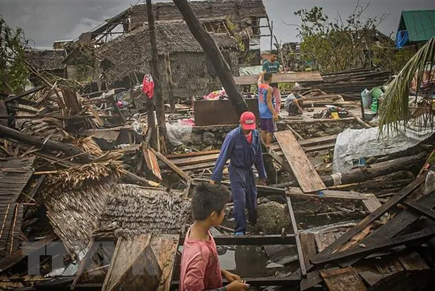 Nhà cửa bị tàn phá sau bão Vongfong tại thị trấn San Policarpo, tỉnh Đông Samar, Philippines. Ảnh: AFP/TTXVN