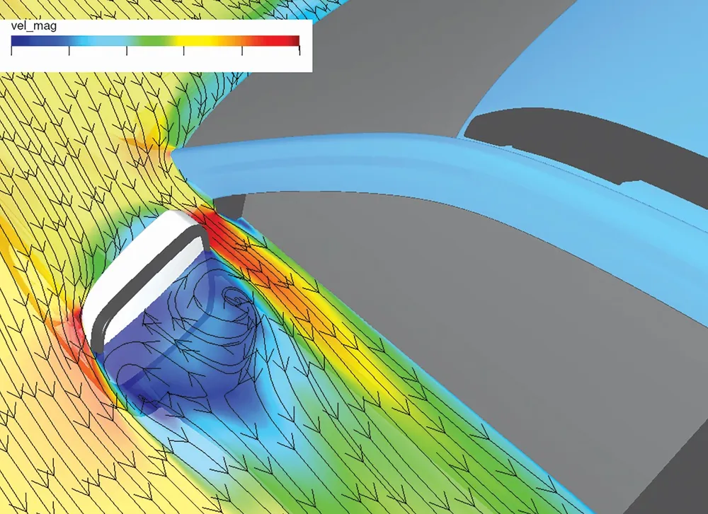 Mặt cắt ngang của luồng không khí xung quanh gương cho thấy hiệu quả ngăn chặn tiếng ồn: Thiết kế của ốp gương và chân gương giúp tạo ra luồng không khí chuyển động nhanh, ngăn tách giữa gương chiếu hậu và kính bên. Từ đó giúp ngăn chặn tiếng ồn gió tạo ra ở gương chiếu hậu lọt vào khoang xe. (Chú thích: Màu Đỏ = Không khí di chuyển với tốc độ Nhanh; Xanh = Không khí di chuyển với tốc độ Chậm)