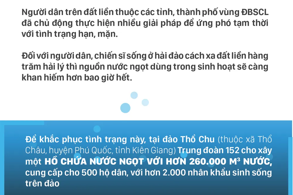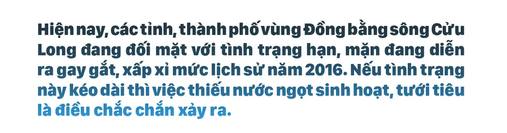 Hiện nay, các tỉnh, thành phố vùng Đồng bằng sông Cửu Long đang đối mặt với tình trạng hạn, mặn đang diễn ra gay gắt, xấp xỉ mức lịch sử năm 2016. Nếu tình trạng này kéo dài thì việc thiếu nước ngọt sinh hoạt, tưới tiêu là điều chắc chắn xảy ra.