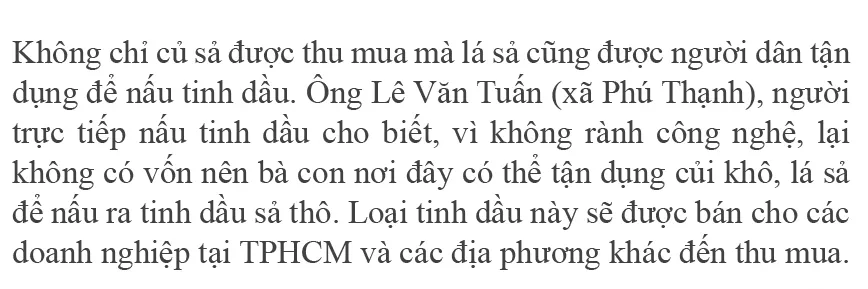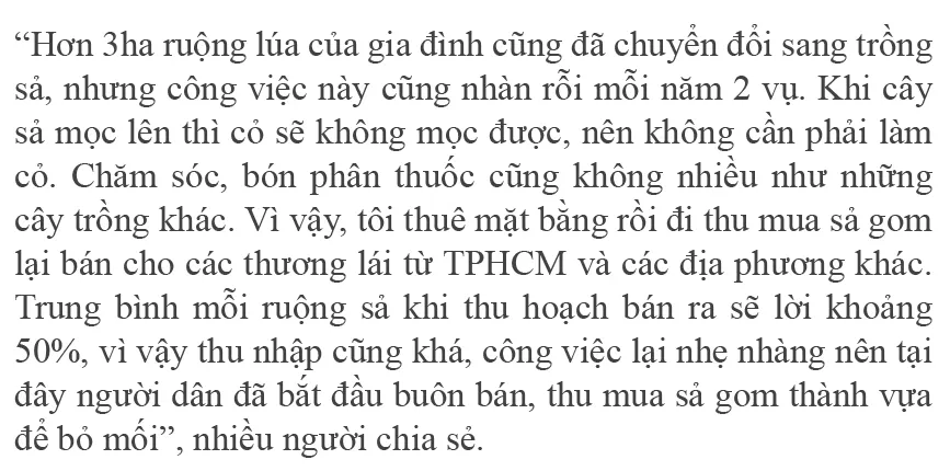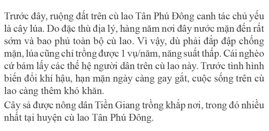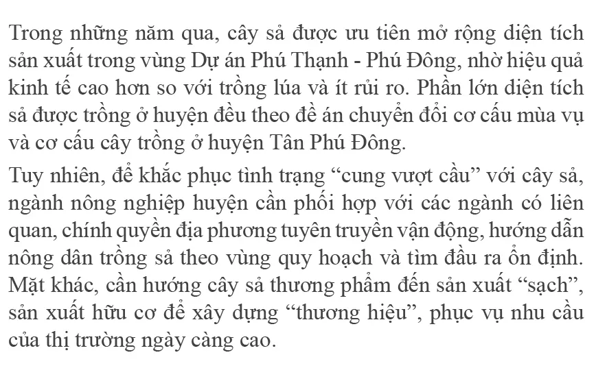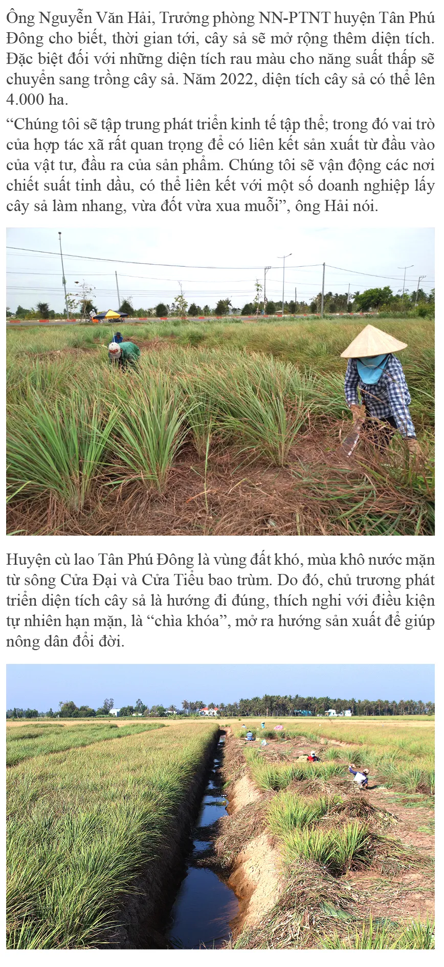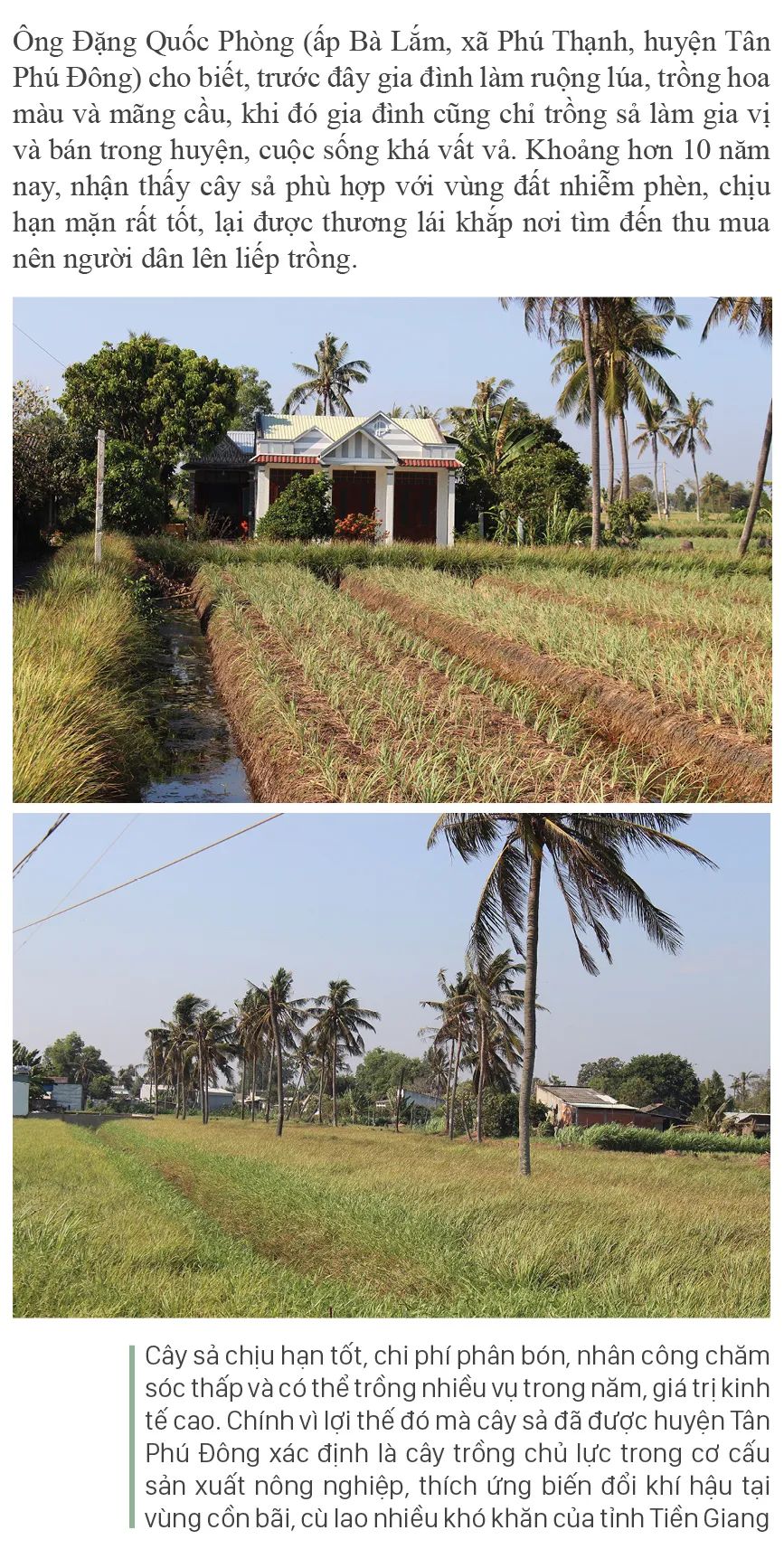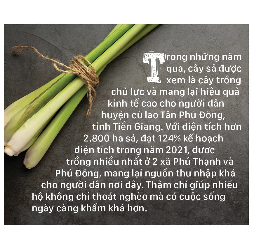 Trong những năm qua, cây sả được xem là cây trồng chủ lực và mang lại hiệu quả kinh tế cao cho người dân huyện cù lao Tân Phú Đông, tỉnh Tiền Giang. Với diện tích hơn 2.800 ha sả, đạt 124% kế hoạch diện tích trong năm 2021, được trồng nhiều nhất ở 2 xã Phú Thạnh và Phú Đông, mang lại nguồn thu nhập khá cho người dân nơi đây. Thậm chí giúp nhiều hộ không chỉ thoát nghèo mà có cuộc sống ngày càng khấm khá hơn.