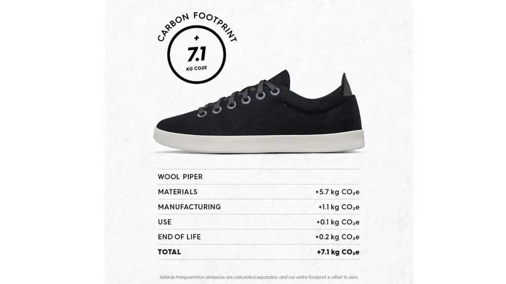 Theo Forbes, 7,6kg carbon là mức trung bình cho mỗi sản phẩm giày dép Allbirds, trong khi lượng khí thải carbon của một túi nhựa khoảng 1,6kg, quần jeans tầm 29,6kg và xe đạp khoảng 240kg. Allbirds cùng các chuyên gia khí thải carbon phát triển công cụ đo cường độ carbon, chú trọng từ chất liệu, sự phát triển, sản xuất, cho đến khâu đóng gói và vận chuyển. Sáng kiến này được đưa ra nhằm tiếp nối Quỹ Carbon được hãng giới thiệu vào năm ngoái.