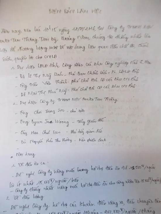 Theo biên bản cam kết, đại diện công ty Panko, ông Choi Young Joo, Chủ tịch; ông Byun Jae Woong, Tổng giám đốc; ông Han Chul Joon, Phó tổng giám đốc, cùng đại diện LĐLĐ tỉnh, công đoàn các khu công nghiệp tỉnh Quảng Nam làm việc trực tiếp. Thống nhất đưa ra 4 cam kết, thứ nhất, hai bên đã thống nhất nâng mức hỗ trợ tiền ăn từ 11.500 đồng/người lên 15.000 đồng/người/bữa và cải thiện bếp ăn công ty.