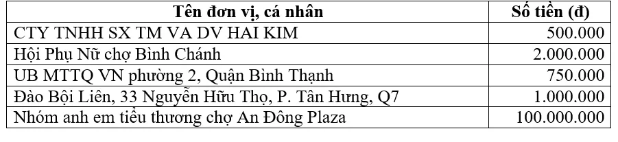 Và đã kịp thời chuyển những tình cảm, tấm lòng của các đơn vị, cá nhân trực tiếp chỉ định hỗ trợ các y, bác sĩ, nhân viên y tế, các chiến sĩ công an, quân sự, lực lượng liên ngành, tình nguyện viên và đồng hành, chia sẻ với những khó khăn của người nghèo, người bán vé số, người có hoàn cảnh khó khăn bị ảnh hưởng dịch Covid-19, với số tiền hơn 40 tỷ 067 triệu đồng, cụ thể: