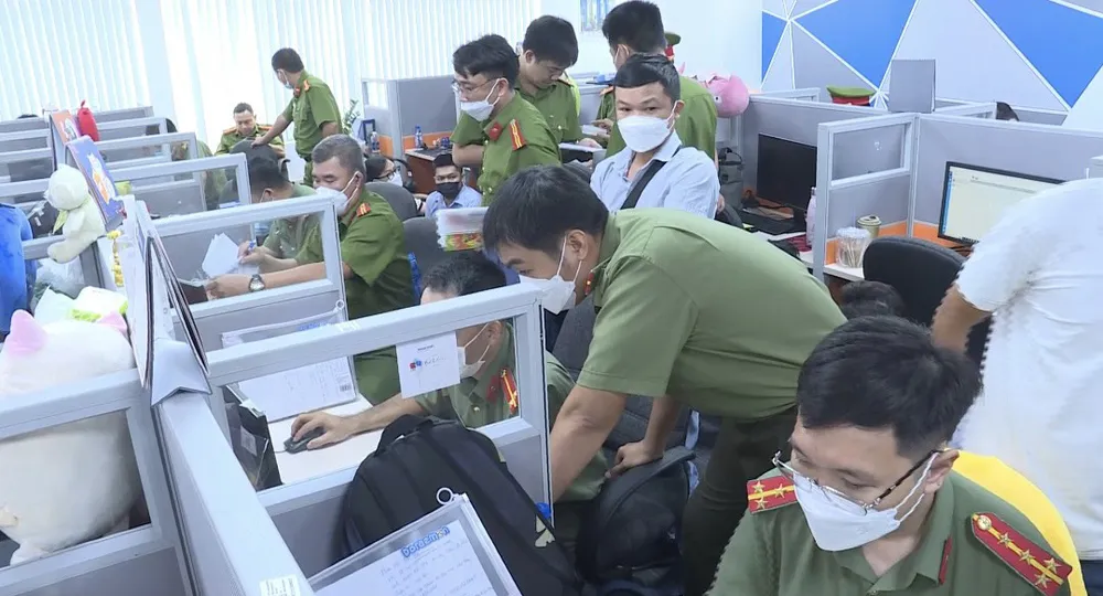 Công an khám xét nơi các nhân viên đòi nợ làm việc. Ảnh: CHÍ THẠCH