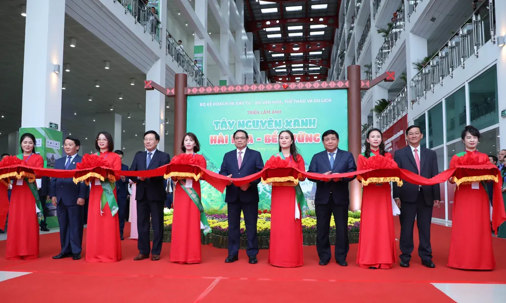Thủ tướng Phạm Minh Chính và các đại biểu cắt băng khai mạc triển lãm. Ảnh: ĐOÀN KIÊN