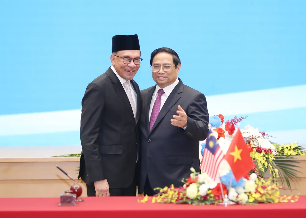 Thủ tướng Phạm Minh Chính và Thủ tướng Malaysia Anwar Ibrahim chứng kiến lễ ký kết các văn kiện, chiều 20-7. Ảnh QUANG PHÚC |