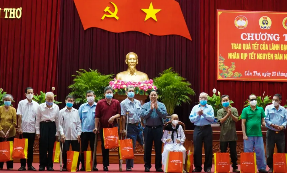 Tại hội trường Thành ủy Cần Thơ, Thủ tướng Phạm Minh Chính và đoàn công tác Trung ương đã chúc tết và trao tặng 500 suất quà cho các gia đình chính sách, hộ nghèo, đoàn viên công đoàn, công nhân, lao động nghèo bị ảnh hưởng bởi dịch Covid-19, nạn nhân chất độc màu da cam.