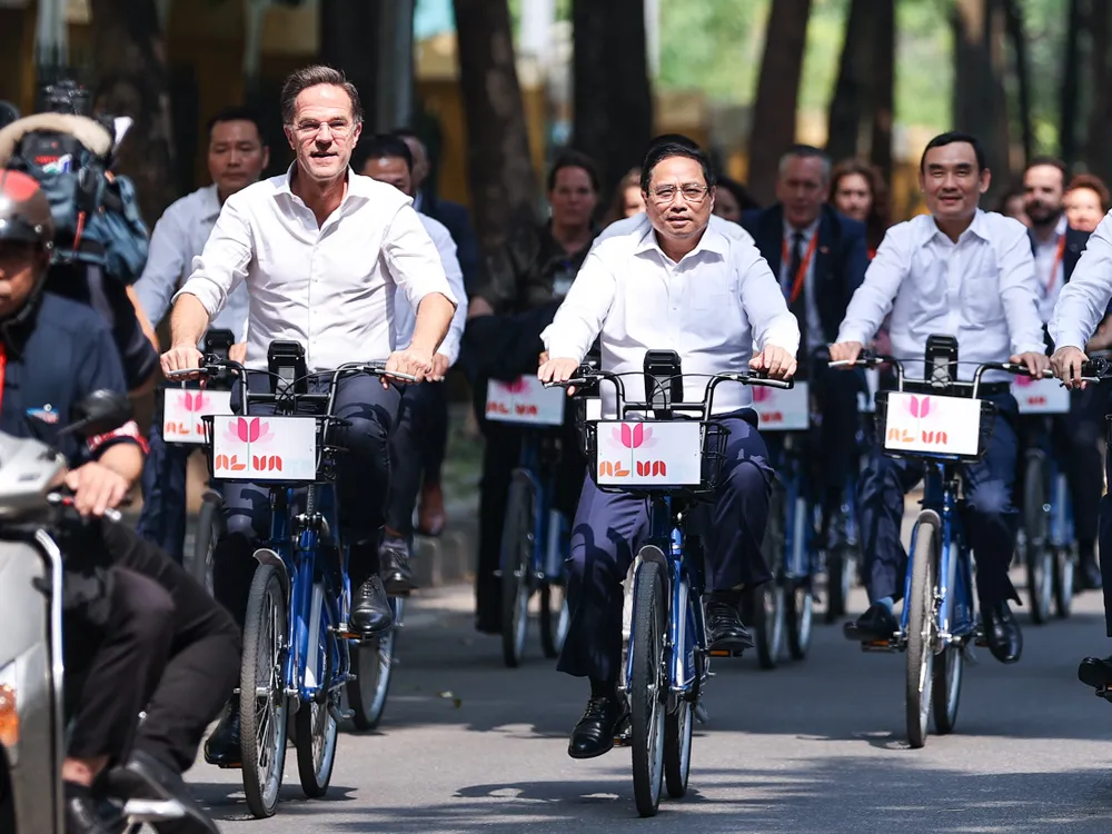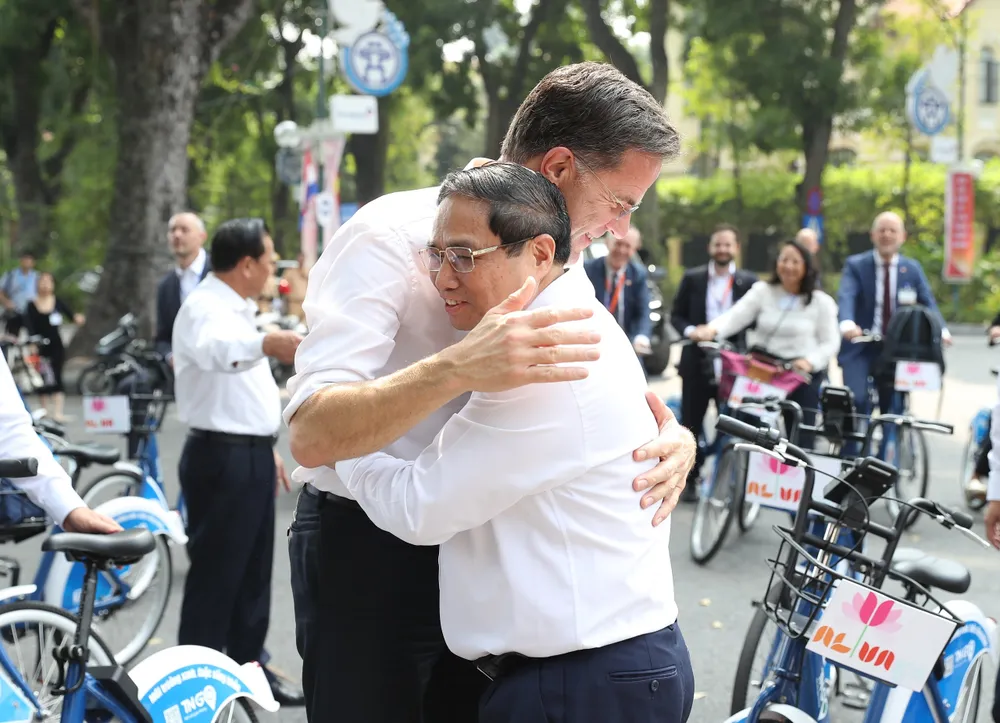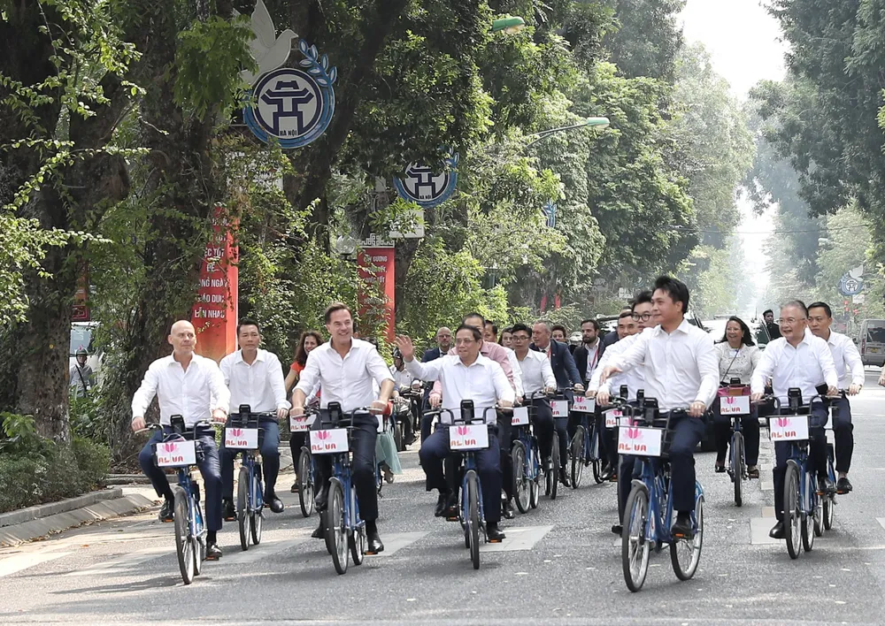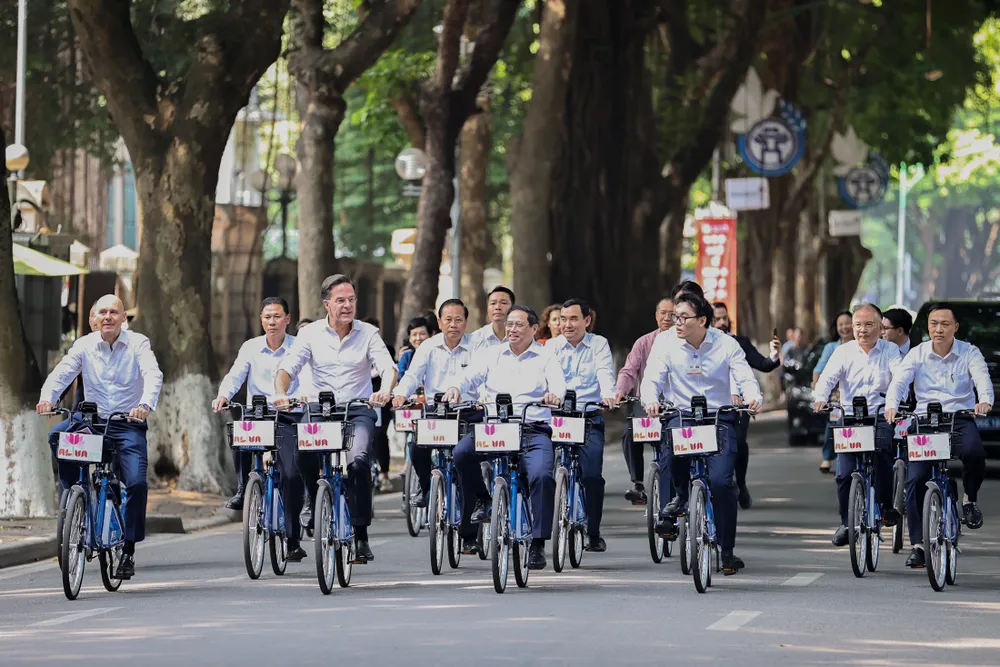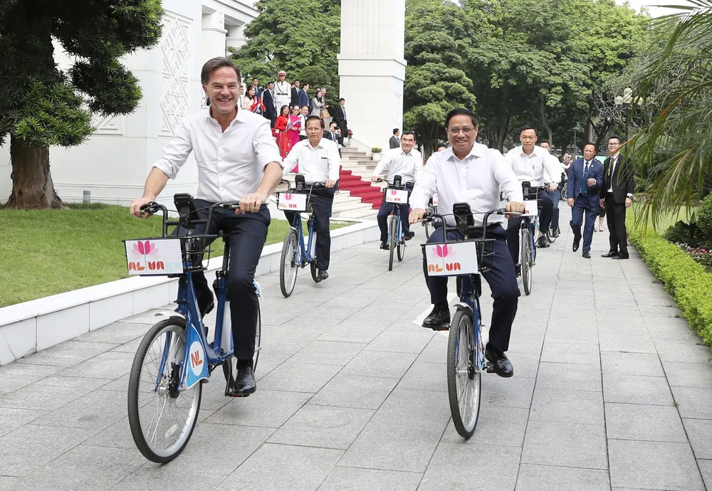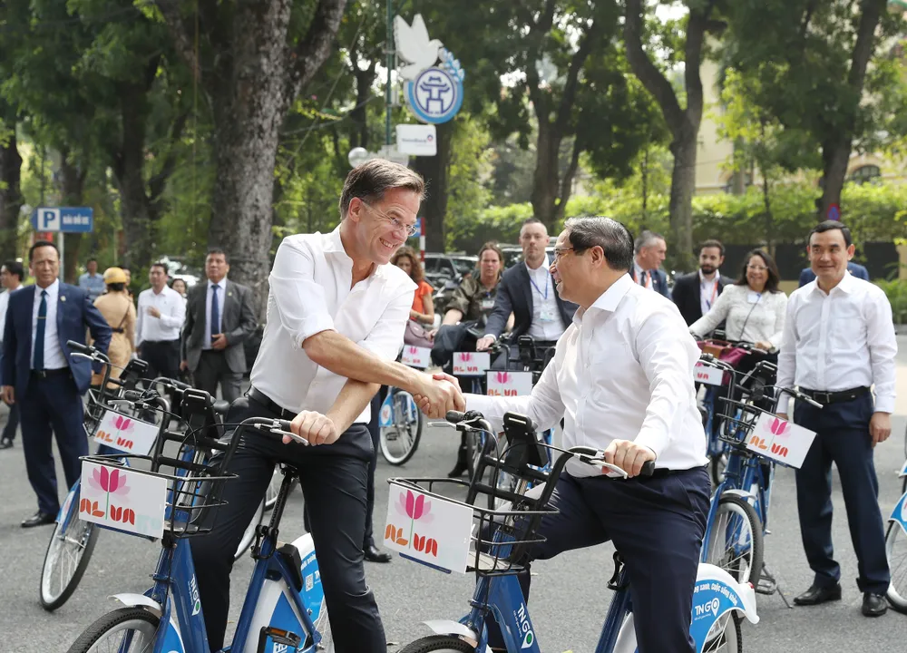 Tiếp đó, Thủ tướng Phạm Minh Chính và Thủ tướng Hà Lan Mark Rutte đã có hoạt động đạp xe dạo thăm đường phố Hà Nội.