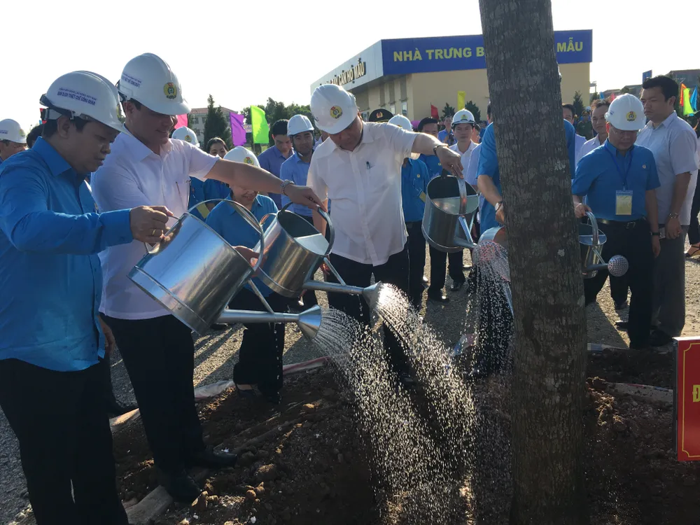 Tới thăm khu thiết chế công đoàn của khu công nghiệp Đồng Văn II, Thủ tướng đã trồng cây lưu niệm và tham quan dự án khu nhà mẫu dành cho công nhân đang làm việc tại khu công nghiệp này.
