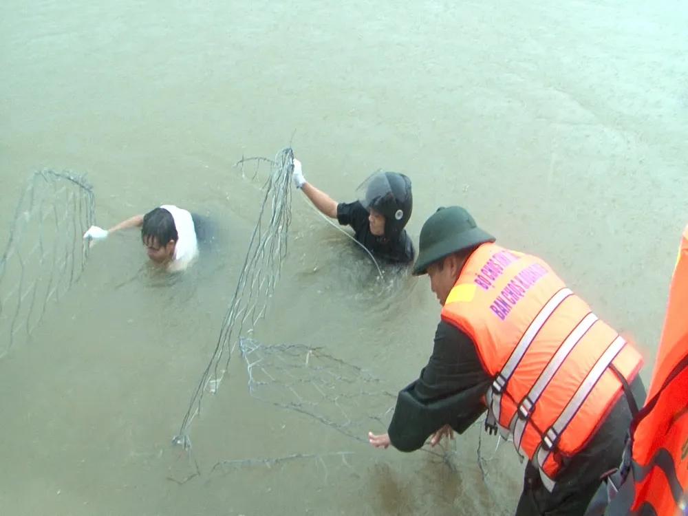 Các lực lượng đã sử dụng hàng trăm rọ đá cỡ lớn, đá hộc, sắt quận làm thành từng rọ để gia cố các vị trí bị hở hàm ếch, bị xoáy nước đánh sạt lở.