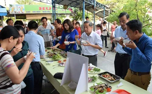 Phó Chủ tịch UBND tỉnh Thừa Thiên – Huế Phan Ngọc Thọ (áo trắng, giữa) cùng người tiêu dùng ăn cá biển đã được chế biến tại siêu thị Co.op Mart Huế.