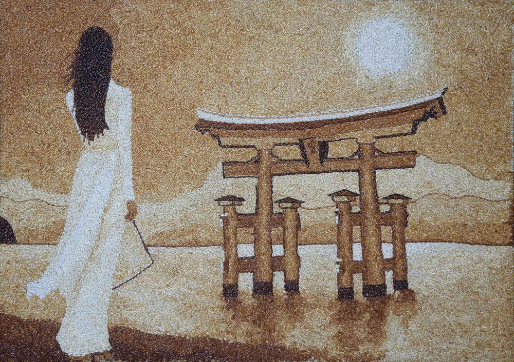Bức tranh bằng gạo lức được Thúy Vân chuẩn bị cho buổi đấu giá từ thiện