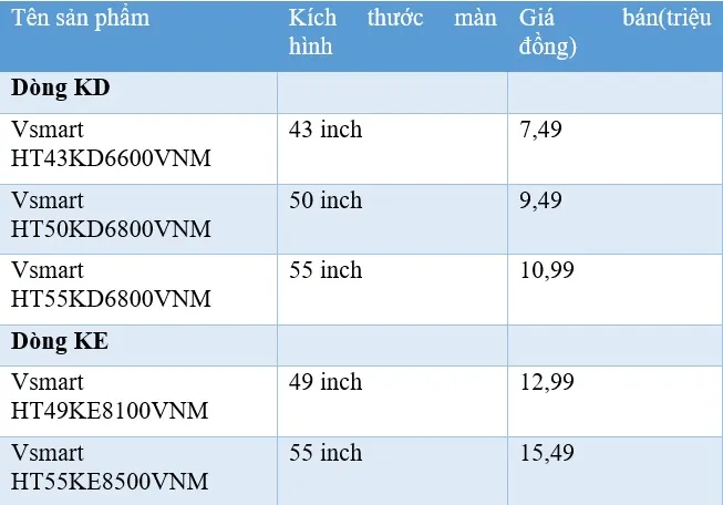 Ngoài 2 phiên bản này, VinSmart còn có thêm 3 mẫu ti vi khác gồm: 49 inch KE8100 (12.990.000 đồng); 55 inch DK6800 (10.990.000 đồng) và 50 inch KD6800 (9.490.000 đồng). Tất cả đều có thiết kế đơn giản, trang nhã, vừa đáp ứng được nhu cầu giải trí của người dùng, vừa là nội thất trang trí đầy tính hiện đại đến từ một thương hiệu công nghệ Việt.