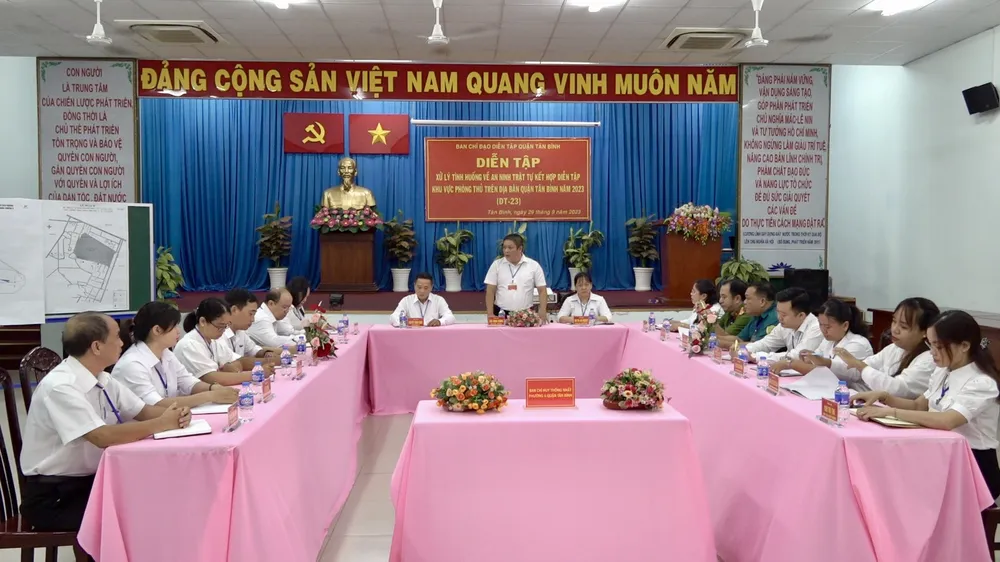Cũng trong ngày, Công an quận Bình Tân tổ chức diễn tập xử lý tình huống tập trung đông người, gây rối an ninh trật tự, kết hợp diễn tập chiến đấu phòng thủ, phòng thủ dân sự trên địa bàn năm 2023. Việc diễn tập là nhiệm vụ chính trị quan trọng nhằm nâng cao năng lực lãnh đạo của tổ chức Đảng, hiệu lực quản lý, điều hành của chính quyền về quốc phòng an ninh; phát huy vai trò tham mưu của cơ quan quân sự, công an, các ban, ngành, đoàn thể, các tổ chức chính trị - xã hội trong đảm bảo an ninh trật tự trên địa bàn quận.
