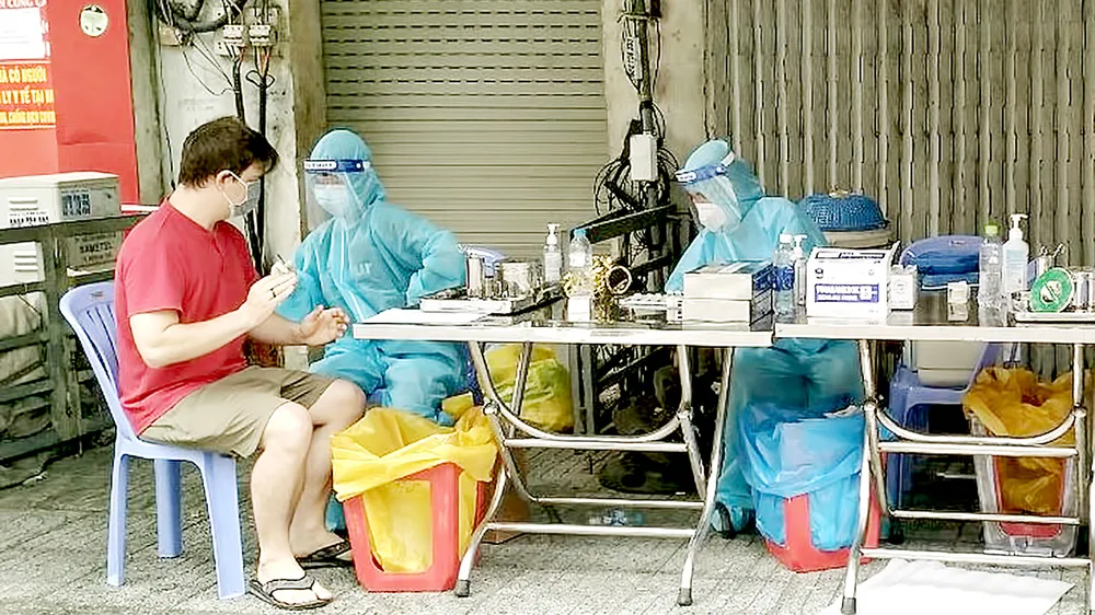 Theo khung giờ được báo trước, bà Phương cùng 48 người (từ 18 đến dưới 65 tuổi, không có bệnh nền) trong xóm đã có mặt tại đường số 11. Tại đây, một điểm tiêm “dã chiến” nhanh chóng được thiết lập, với các bàn sàng lọc, bàn tiêm cùng những dãy ghế được xếp ngay ngắn, tạo khoảng cách an toàn để người dân ngồi chờ đến lượt tiêm. Đội tiêm lưu động gọi tên từng người và lấy mẫu xét nghiệm nhanh, tổ chức khám sàng lọc trước khi tiêm vaccine.