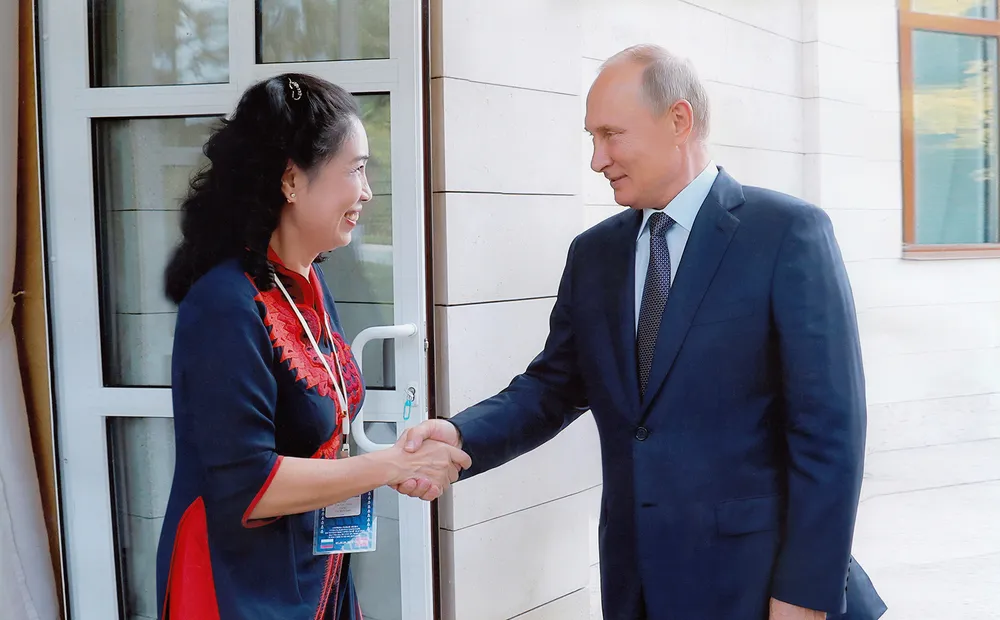 Bà Huỳnh Ngọc Vân, Giám đốc Bảo tàng Áo Dài, tiếp nhận áo dài từ bà Nguyễn Phương Nga (bên trái)