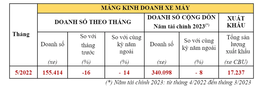 Theo đó, trong tháng 5-2022, 155.414 xe gắn máy đã được bán ra thị trường, giảm 16% so với tháng trước và giảm 14% so với cùng kỳ năm ngoái. Trong đó, mẫu xe Wave Alpha đạt doanh số bán ra tốt nhất với 36.893 xe, chiếm 23,7% tổng doanh số bán xe máy của Honda Việt Nam trong tháng 5-2022. Tiếp đến là dòng Winner X với 8.423 xe, chiếm 5,4% tổng doanh số bán xe máy của hãng trong tháng 5 này.