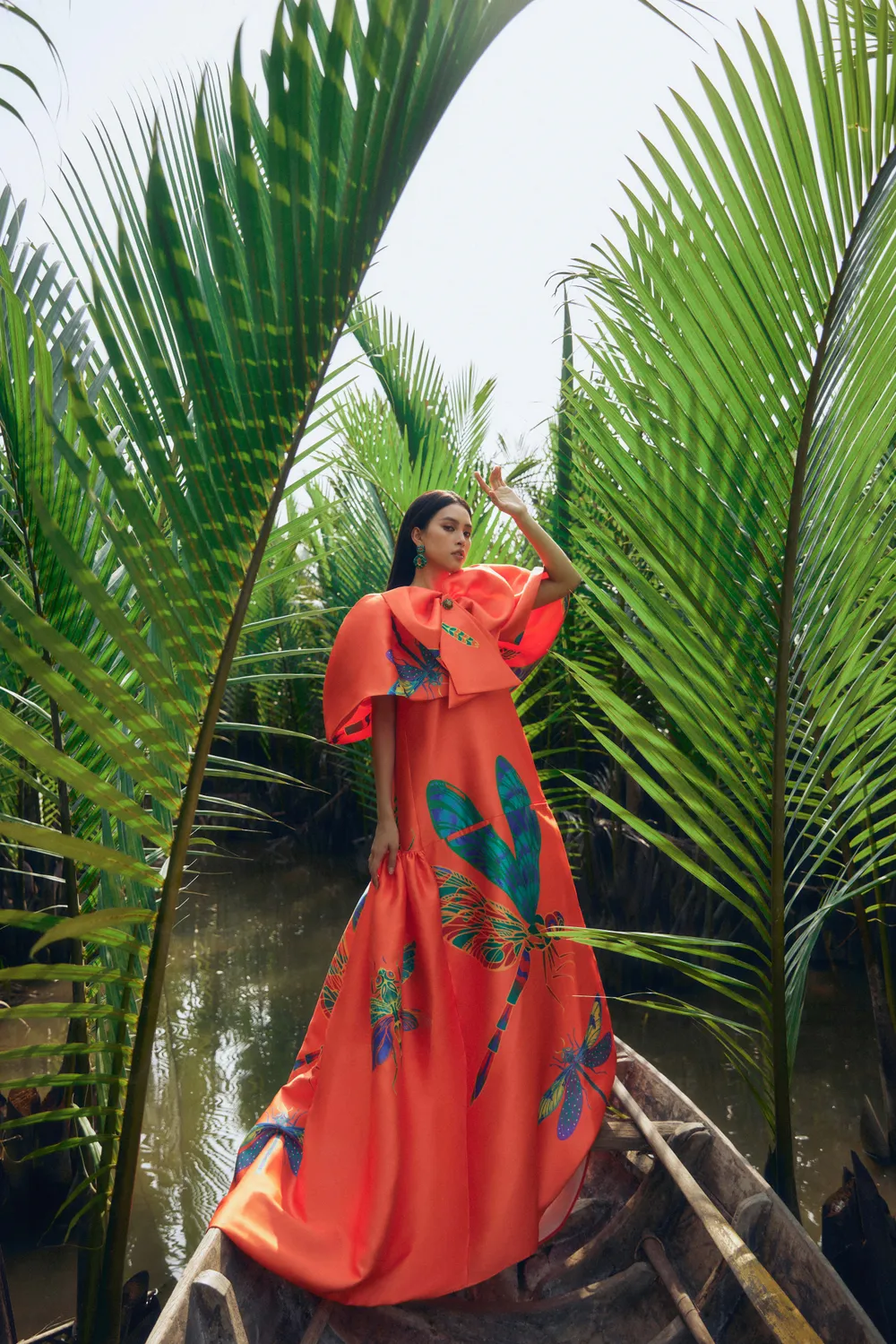 Họa tiết chủ đạo trong bộ sưu tập này là chuồn chuồn sắc màu được cách điệu bắt mắt trên sắc cam tươi mát.