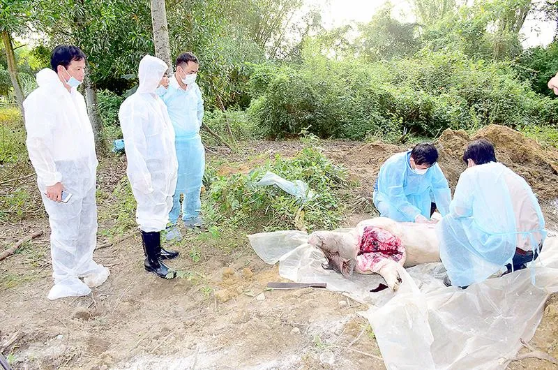 Chi cục Thú y tỉnh Thừa Thiên - Huế lấy bệnh phẩm và tiến hành tiêu hủy heo nhiễm dịch tả heo châu Phi ở thôn Hiền An
