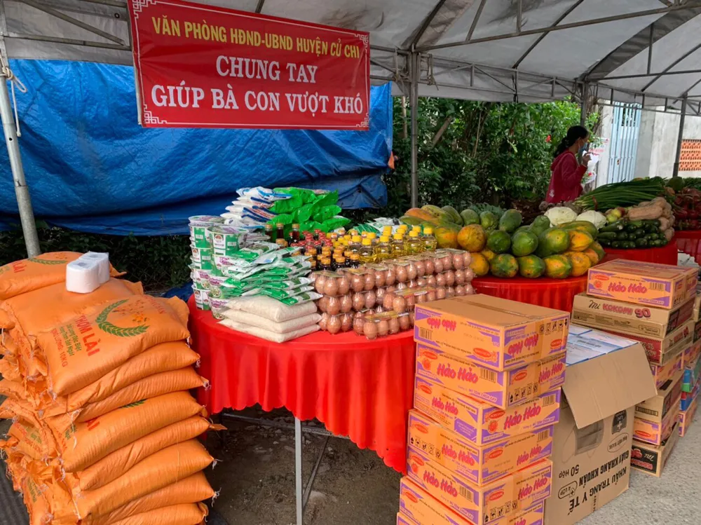 Rau quả tại gian hàng 0 đồngBên cạnh đó, lãnh đạo Huyện ủy, HĐND, UBND, Ủy ban MTTQ Việt Nam huyện Củ Chi đã ủng hộ kinh phí hỗ trợ các bệnh viện huyện Củ Chi tuyến đầu chống dịch và tổ chức các đoàn đến thăm, tặng quà như: sữa, mì ăn liền, xúc xích, bánh ngọt, trái cây cho đội ngũ tham gia trực chốt cả ngày lẫn đêm tại các điểm phong tỏa, góp phần động viên tinh thần, giúp họ an tâm công tác.