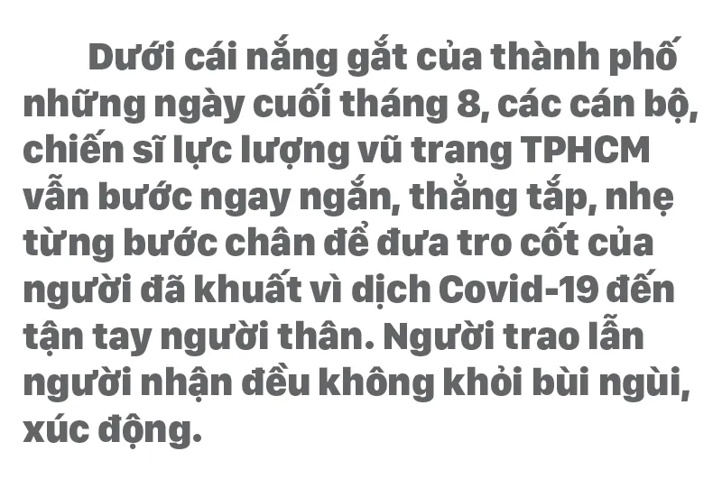 Dưới cái nắng gắt của thành phố những ngày cuối tháng 8, các cán bộ, chiến sĩ lực lượng vũ trang TPHCM vẫn bước ngay ngắn, thẳng tắp, nhẹ từng bước chân để đưa tro cốt của người đã khuất vì dịch Covid-19 đến tận tay người thân. Người trao lẫn người nhận đều không khỏi bùi ngùi, xúc động.