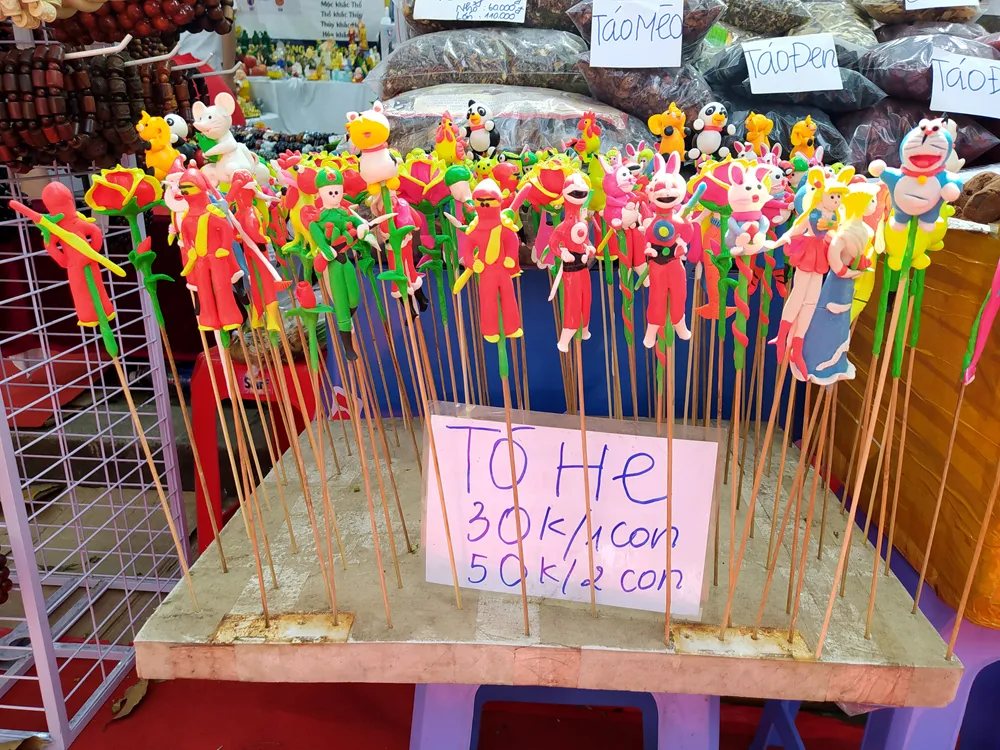 Bên cạnh những món đồ chơi hiện đại là các loại lego, đồ chơi nhựa… giá thành rẻ, đủ chủng loại…, những gian hàng tò he như một nét chấm phá, điểm tô thêm không gian cho các lễ hội xuân sắc màu ở mảnh đất phương Nam nắng gió.