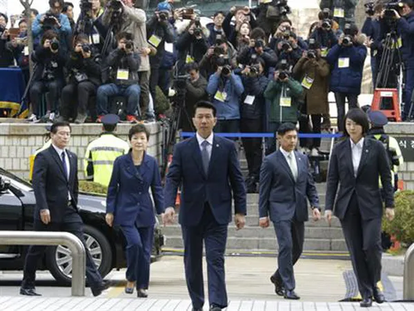 Cựu Tổng thống Park Geun-hye (thứ 2 từ trái sang) đến Tòa án Trung tâm Seoul sáng 30-3-2017. Ảnh: AP