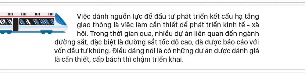 Việc dành nguồn lực để đầu tư phát triển kết cấu hạ tầng giao thông là việc làm cần thiết để phát triển kinh tế - xã hội. Trong thời gian qua, nhiều dự án liên quan đến ngành đường sắt, đặc biệt là đường sắt cao tốc, đã được báo cáo với vốn đầu tư khủng. Điều đáng nói là có những dự án được đánh giá là cần thiết, cấp bách thì chậm triển khai.