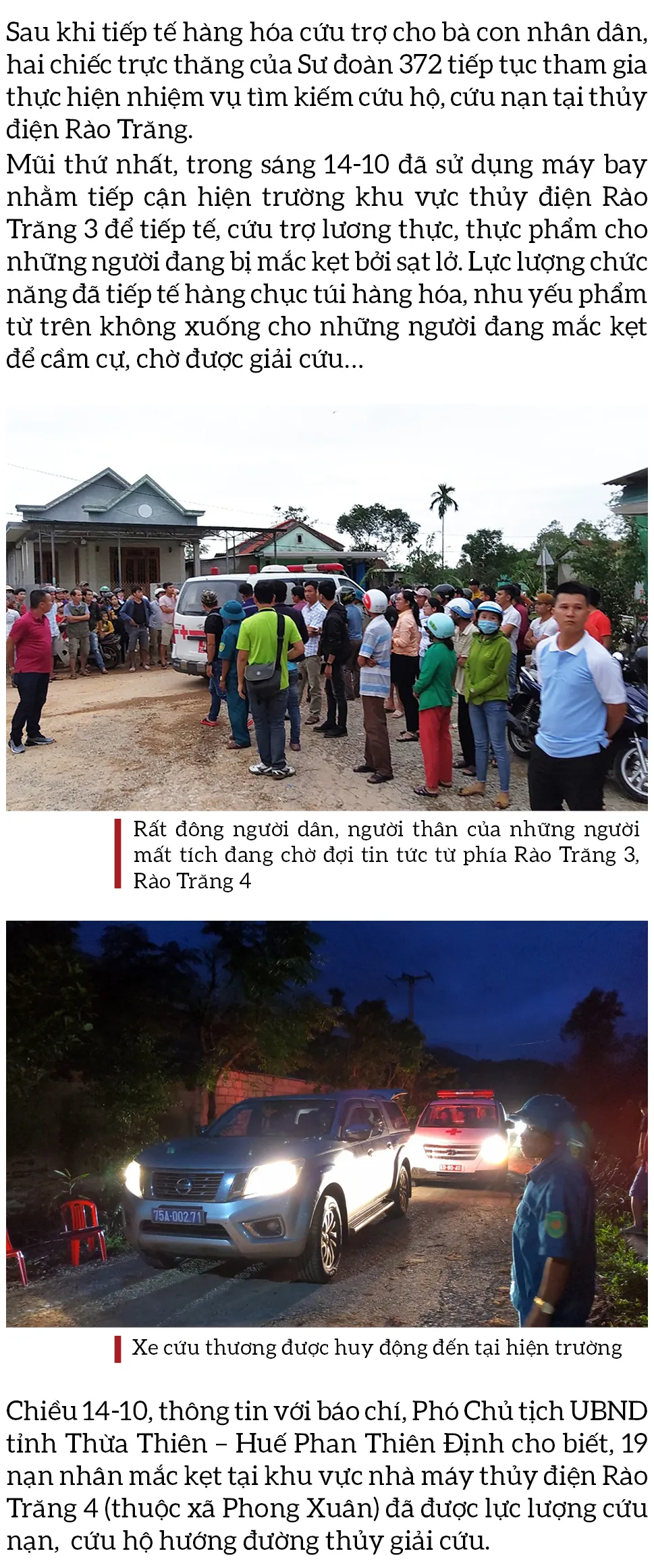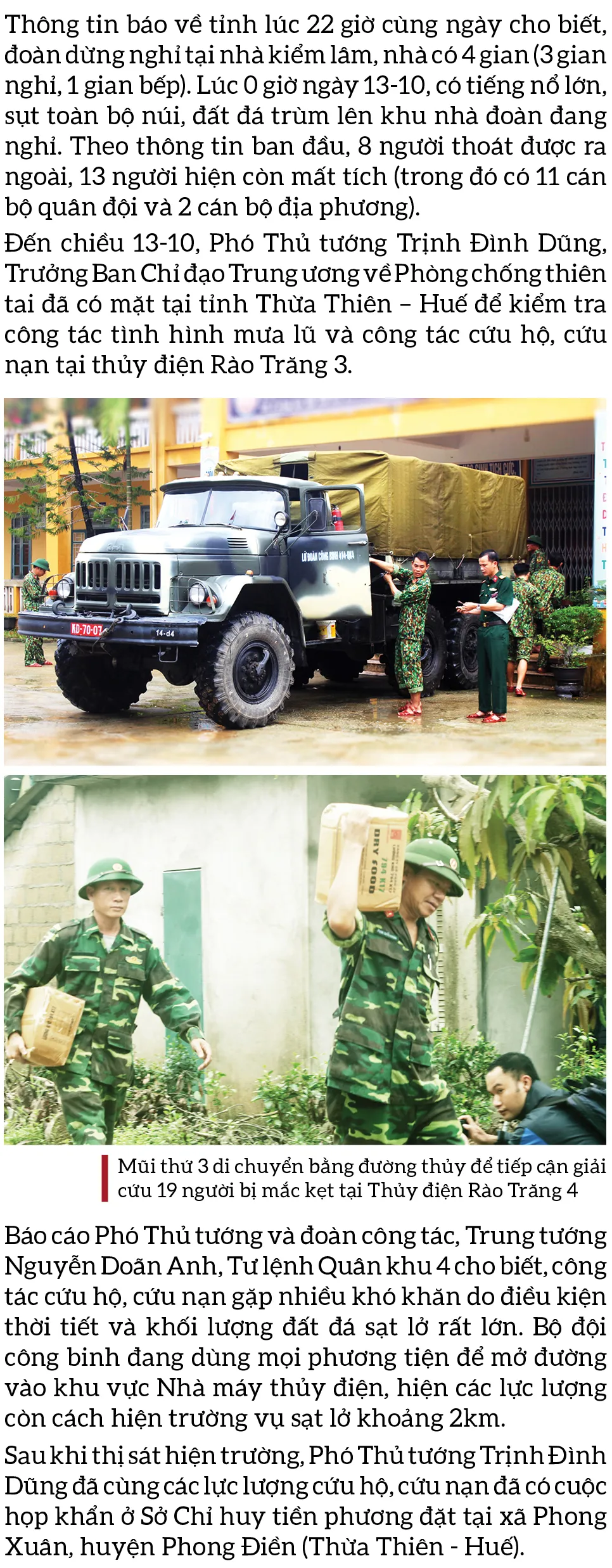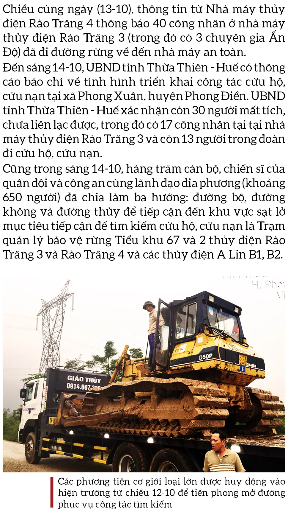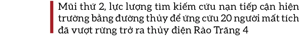 Những ngày vừa qua, lực lượng chức năng đang nỗ lực tìm kiếm tất cả những người mất tích, những cán bộ, chiến sĩ trong đoàn cứu hộ, cứu nạn và công nhân đang làm việc ở thủy điện Rào Trăng 3.