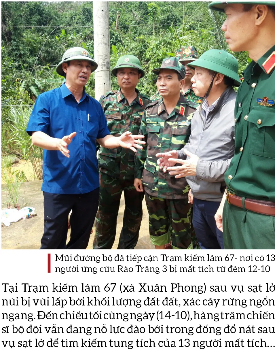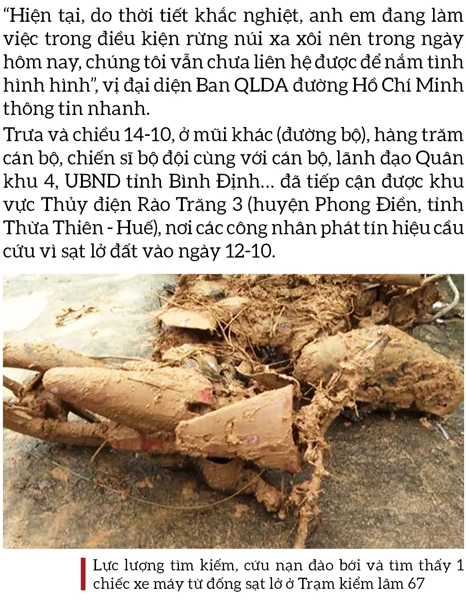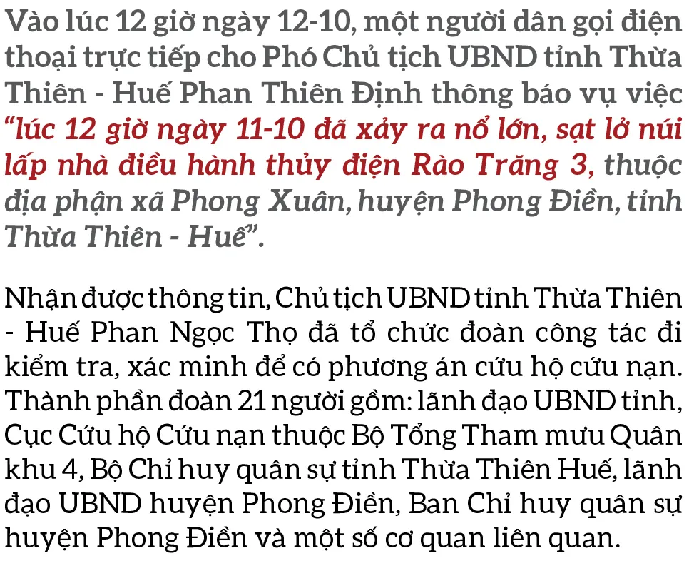 Những ngày vừa qua, lực lượng chức năng đang nỗ lực tìm kiếm tất cả những người mất tích, những cán bộ, chiến sĩ trong đoàn cứu hộ, cứu nạn và công nhân đang làm việc ở thủy điện Rào Trăng 3.