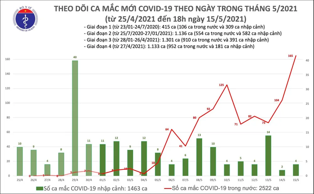 Tính đến tối cùng ngày, Việt Nam có tổng cộng 2.522 ca mắc Covid-19 ghi nhận trong nước và 1.463 ca nhập cảnh. Số lượng ca mắc mới tính từ ngày 27-4 tới nay là 952 ca. Số lượng mẫu xét nghiệm từ 29-4 đến nay là 482.900 mẫu.