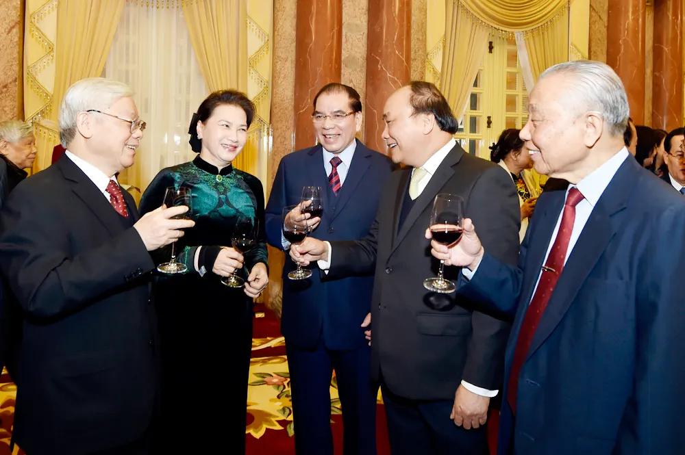 Trong không khí vui mừng, phấn khởi đón chào năm mới, Tổng Bí thư Nguyễn Phú Trọng cùng các đại biểu có mặt đã nâng cốc chúc sự nghiệp cách mạng của nhân dân ta đạt được nhiều thắng lợi to lớn hơn nữa; chúc Đảng ta ngày càng trưởng thành, vững mạnh; đất nước ta ngày càng phát triển, cường thịnh; nhân dân ta ngày càng ấm no, nhà nhà vui tươi, người người hạnh phúc.