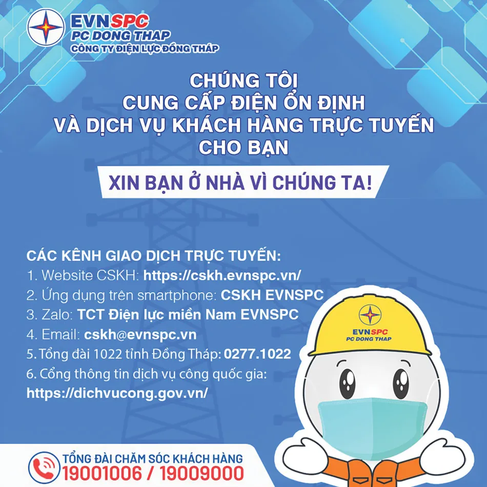 Khi thực hiện các giao dịch về điện theo hình thức trực tuyến, hoặc có bất cứ thắc mắc nào trong quá trình sử dụng điện, khách hàng có thể liên hệ ngay đến tổng đài CSKH 24/7 của EVNSPC (19001006 hoặc19009000) để được hướng dẫn, hỗ trợ giải quyết kịp thời, đại diện EVNSPC nhấn mạnh.