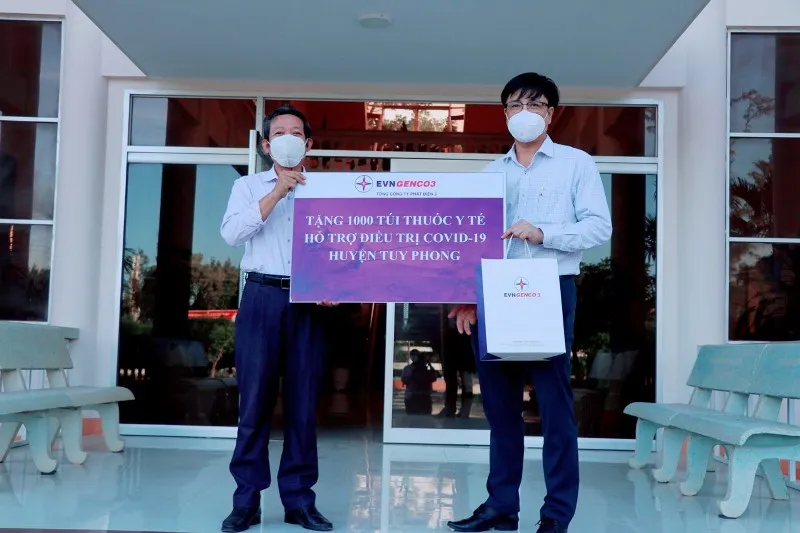Đại diện huyện Tuy Phong, tỉnh Bình Thuận nhận hỗ trợ từ Công ty Nhiệt điện Vĩnh TânĐại diện ngành y tế huyện Tuy Phong cho biết, dịch Covid-19 trên địa bàn huyện phức tạp, nhiều ca F0 không triệu chứng thực hiện điều trị tại nhà, trong khi số lượng túi thuốc không đáp ứng đủ để phục vụ bệnh nhân. Với sự hỗ trợ kịp thời các túi thuốc y tế của Tổng Công ty Phát điện 3 và Công ty Nhiệt điện Vĩnh Tân, đã giúp cho ngành y tế địa phương giảm bớt khó khăn trong việc điều trị bệnh nhân Covid-19 tại nhà và sự động viên tinh thần để chính quyền, người dân Tuy Phong chung tay vượt qua đại dịch Covid-19.