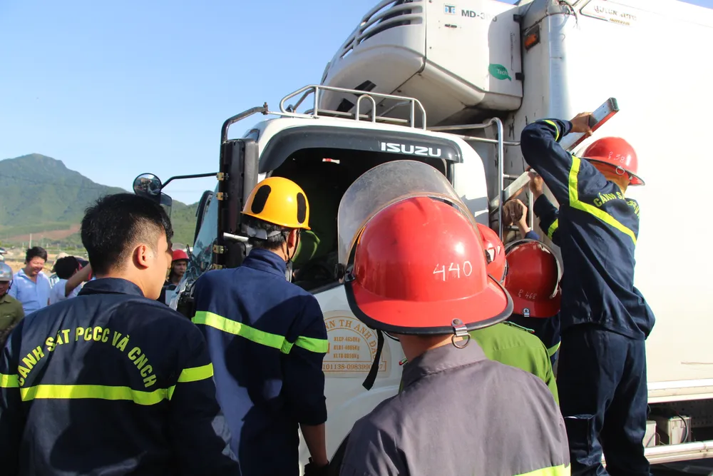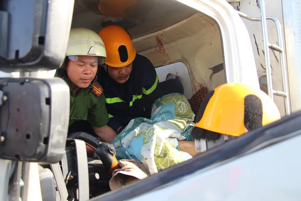 Vụ tai nạn khiến tài xế Trần Văn Hiền (46 tuổi, trú quận Thủ Đức, TPHCM) chết tại chỗ, phụ xe là anh Nguyễn Văn Kiều (29 tuổi, trú Sơn Tịnh, Quảng Ngãi) bị thương nặng và mắc kẹt bên trong cabin bị biến dạng.