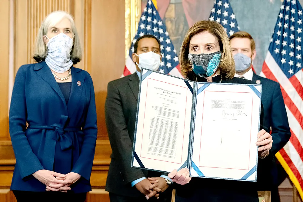 Trước đó, đêm 13-1 (giờ Mỹ), với đa số phiếu tán thành, Hạ viện Mỹ đã thông qua điều khoản luận tội Tổng thống Trump, mở đường cho phiên tòa xét xử tại Thượng viện trong thời gian tới. Theo điều khoản luận tội, đảng Dân chủ cáo buộc Tổng thống Trump kích động biểu tình ngày 6-1 khi kêu gọi những người ủng hộ tiến về Đồi Capitol trong khi lưỡng viện Mỹ tổ chức phiên họp chung kiểm đếm phiếu bầu của đại cử tri; cáo buộc Tổng thống Trump gây nguy hiểm nghiêm trọng đến an ninh Mỹ và các thể chế của chính phủ khi đe dọa tính toàn vẹn của hệ thống dân chủ, can thiệp vào việc chuyển giao quyền lực một cách hòa bình và phản bội lòng tin của mình với tư cách là Tổng thống.