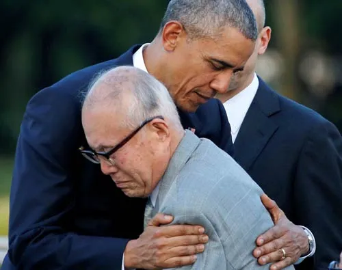Tổng thống Mỹ Barack Obama ôm cụ Shigeaki Mori, 79 tuổi, một nhân chứng sống sót sau vụ nổ bom nguyên tử. Ảnh: REUTERS