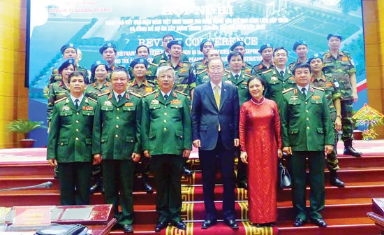 Tổng Thư ký LHQ Ban Ki-moon chụp ảnh chung với lãnh đạo Bộ Quốc phòng, Bộ Ngoại giao và các thành viên Trung tâm gìn giữ hòa bình Việt Nam. Ảnh: TRẦN LƯU