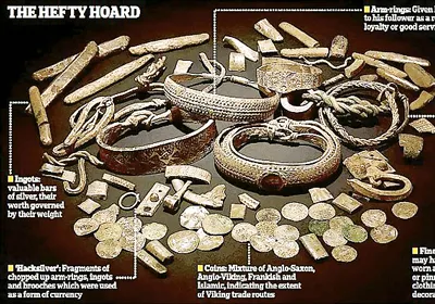 Kho báu gồm 27 đồng tiền bằng bạc cùng nhiều loại nữ trang sắc sảo. Ước tính, giá trị tổng cộng của những cổ vật này lên đến hơn 770.000 USD. Vào thời đại Viking, nhiều nhà thám hiểm, thương nhân, chiến binh, hải tặc ở Bắc Âu đi buôn bán, cướp phá phần lớn châu Âu, Tây Nam châu Á và khám phá vùng Bắc Đại Tây Dương, Đông Bắc châu Mỹ. Kho báu trên được cho là có giá trị cao vì tập hợp được từ nhiều nguồn khác nhau.