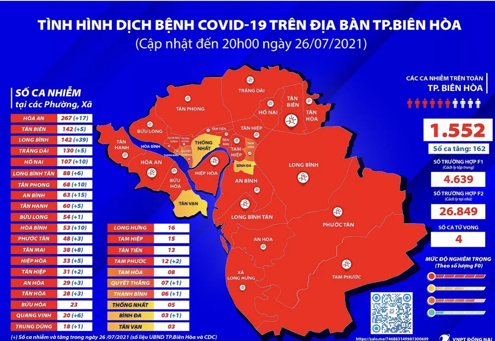 Cụ thể, trong 24 giờ qua, TP Biên Hòa ghi nhận thêm 149 ca mới, nâng tổng số người mắc và nghi mắc Covid-19 trên toàn thành phố là 1.589 ca, trong đó phường Hóa An là nơi có số lượng nhiều nhất với 267 ca, phường Tân Vạn và phường Bình Đa là 2 phường có số lượng ít nhất với mỗi phường có 3 ca. Ngoài ra, còn có 4.639 trường hợp F1 đang được cách ly tập trung, 26.849 trường hợp F2 cách ly tại nhà.