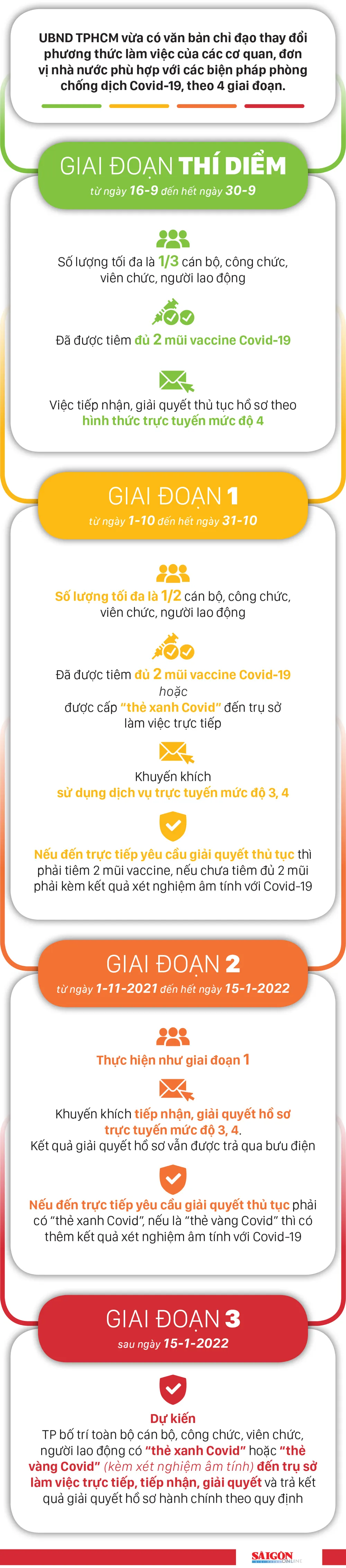 UBND TPHCM vừa có văn bản chỉ đạo thay đổi phương thức làm việc của các cơ quan, đơn vị nhà nước phù hợp với các biện pháp phòng chống dịch Covid-19, theo 4 giai đoạn.