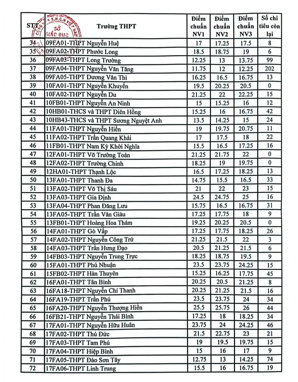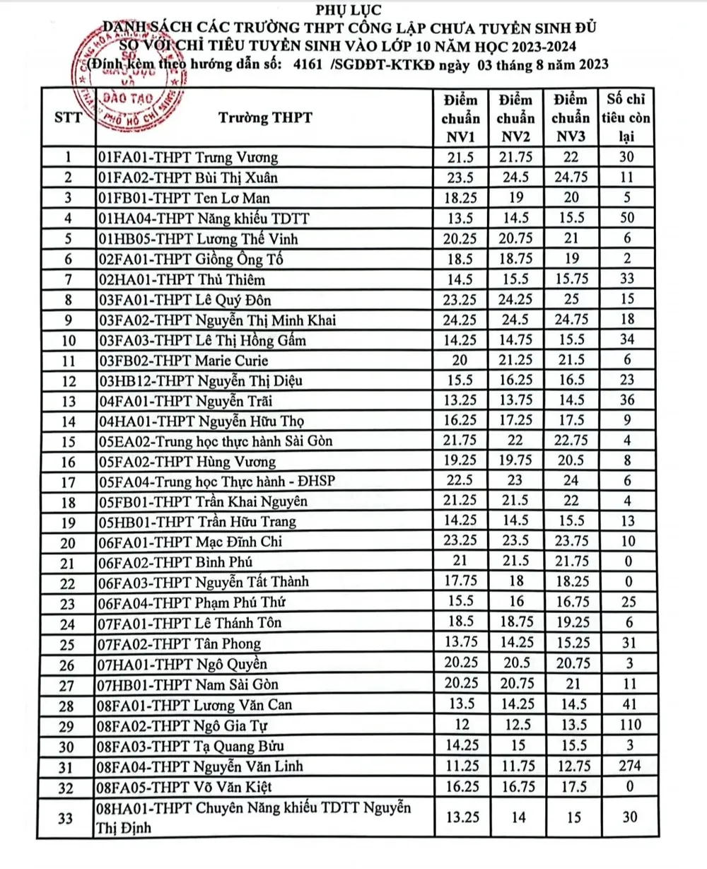 Cụ thể, tại quận 1, Trường THPT Trưng Vương giảm từ 35 chỉ tiêu xuống còn 30 chỉ tiêu bổ sung, THPT Bùi Thị Xuân giảm từ 14 chỉ tiêu xuống còn 11 chỉ tiêu bổ sung, THPT Lương Thế Vinh giảm từ 61 chỉ tiêu xuống còn 6 chỉ tiêu bổ sung...