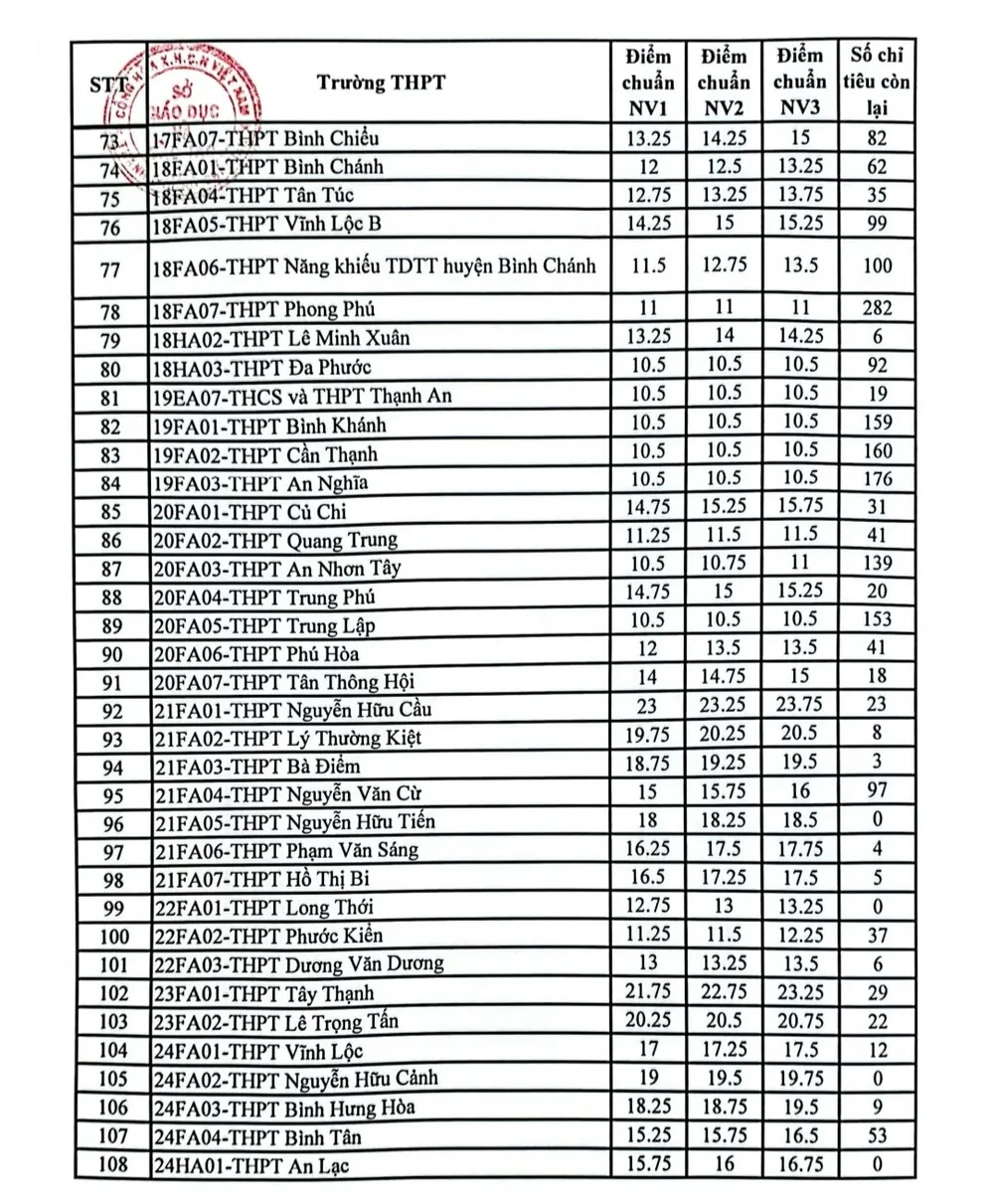 Khu vực quận Bình Thạnh, Trường THPT Gia Định giảm từ 97 chỉ tiêu còn 16 chỉ tiêu bổ sung, THPT Phan Đăng Lưu giảm từ 46 xuống còn 31 chỉ tiêu bổ sung, THPT Võ Thị Sáu giảm từ 17 còn 15 chỉ tiêu bổ sung, THPT Trần Văn Giàu giảm từ 23 còn 9 chỉ tiêu bổ sung...