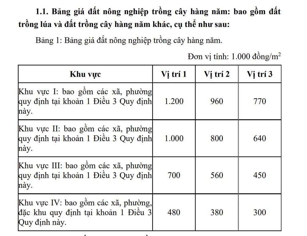 Bảng giá đất nông nghiệp trồng cây hàng năm, bao gồm đất trồng lúa và đất trồng cây hàng năm khác, cụ thể như sau: