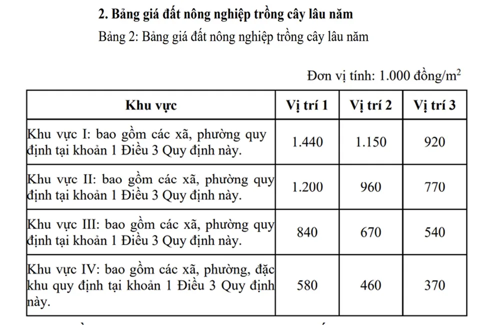 Đồng thời, theo dự thảo bảng giá đất nông nghiệp đã niêm yết lấy ý kiến của Sở Nông nghiệp và Môi trường ngày 26-11. Cụ thể, giá đất nông nghiệp trồng cây hàng năm thấp nhất là 300.000 đồng/m2, cao nhất là 1.200.000 đồng/m2; và giá đất nông nghiệp trồng cây lâu năm thấp nhất 370.000 đồng/m2, cao nhất là 1.440.000 đồng/m2.