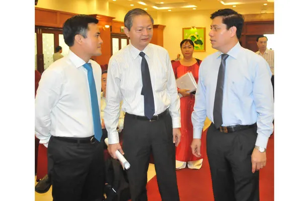 Thứ trưởng Bộ Giao thông Vận tải Nguyễn Ngọc Đông, Phó Chủ tịch UBND TPHCM Lê Văn Khoa, Giám đốc Sở Giao thông Vận tải TPHCM Bùi Xuân Cường (từ phải qua trái) trao đổi bên lề hội thảo
